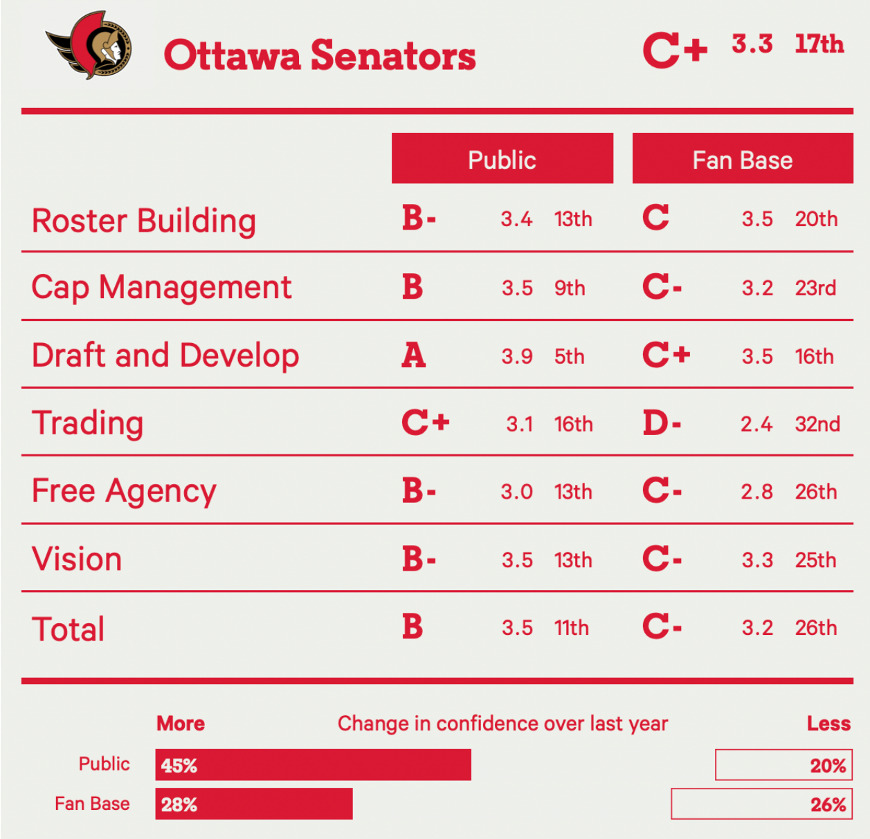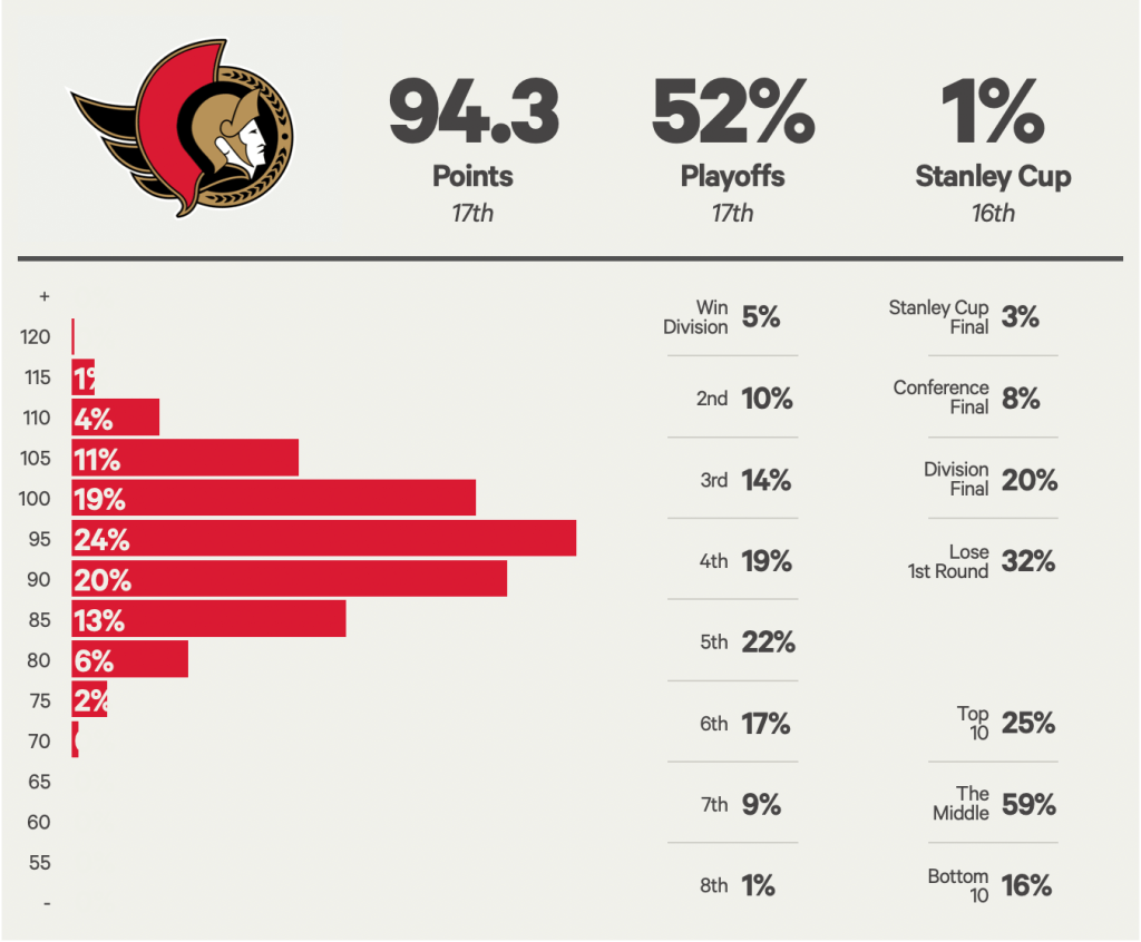 The Athletic are predicting a 10-15 point improvement for the Sens this season (the chart and more detailed analysis is here). I think that’s a fair guess. They see the team as being on the bubble with the potential to be much better or worse depending on the unknowns of the season (which fits a team on the bubble). The Athletic rates their top-six forward group as eighth in the league and rate their blueline 11th (which is a surprise). They warn that the team is overdependent on the powerplay (getting more pp time last season than any other by a wide margin), which is unlikely to repeat itself this year. There are also concerns about the goaltending and Chychrun (who played very protected minutes in Arizona). The thing about Chychrun is he’s on a good contract should things turn sour (the same cannot be said for Korpisalo).